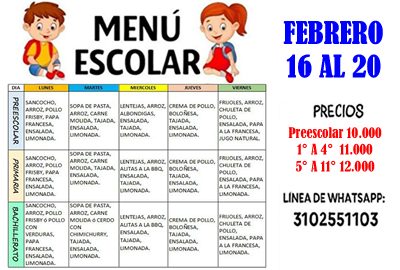 TIENDA ESCOLAR – MENÚ DEL 16 AL 20 DE FEBRERO