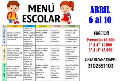 TIENDA ESCOLAR – MENÚ DEL 6 AL 10 DE ABRIL