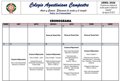 Un saludo de corazón agustiniano para estudiantes, padres, madres y/o acudientes. Compartimos con la comunidad educativa el cronograma de actividades correspondiente al mes de abril de 2026. Sugerimos estar atentos a lasLeer más…