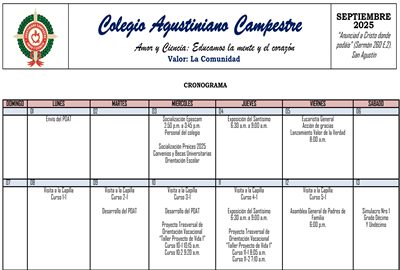 Un saludo de corazón agustiniano para estudiantes, padres, madres y/o acudientes. Compartimos con la comunidad educativa el cronograma de actividades correspondiente al mes de septiembre de 2025. Sugerimos estar atentos a lasLeer más…