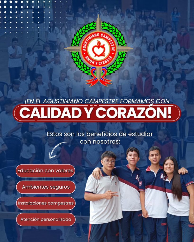 ¡En el Agustiniano Campestre formamos con calidad y corazón! Estos son los beneficios de estudiar con nosotros: Educación con valores – Ambientes seguros – Instalaciones campestres – Atención personalizada – ¡Y mucho más!