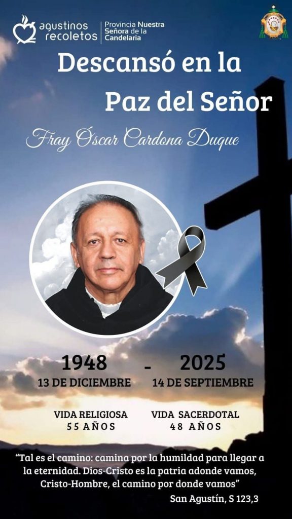 septiembre 15, 2025Uncategorizedadmin La comunidad educativa del colegio Agustiniano Campestre lamenta el sensible fallecimiento de nuestro Fray Oscar Cardona Duque acaecido el pasado 14 de septiembre. Rogamos para que su alma sea recibida en la gloria del Señor.