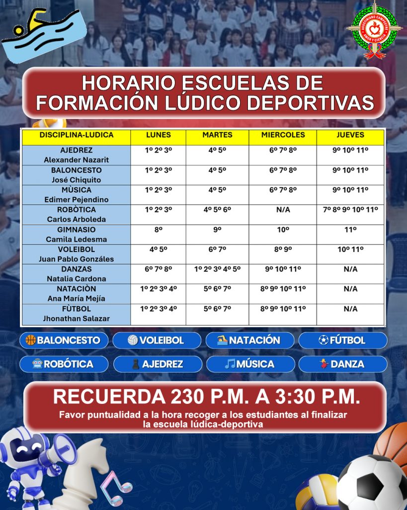 ** El horario de las lúdicas será de 2:30 p.m. a 3:30 p.m., de lunes a jueves, y el tiempo máximo de recogida de los estudiantes será hasta las 3:40 p.m.