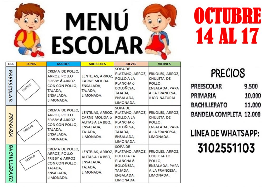 Un cordial saludo para toda nuestra comunidad educativa. Recordamos que la tienda escolar ofrece el servicio de restaurante y almuerzo para los estudiantes desde preescolar a undécimo. Compartimos con estudiantes, padres de familia y/o acudientes, las opciones de almuerzo que se tendrán a disposición del 14 al 17 de octubre. Alguna inquietud, comunicarse directamente con la tienda escolar en el número que aparecen en la imagen