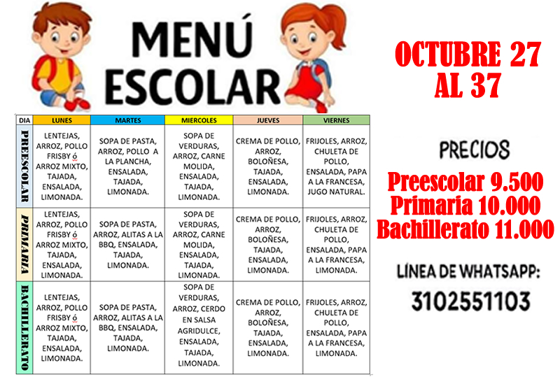 Un cordial saludo para toda nuestra comunidad educativa. Recordamos que la tienda escolar ofrece el servicio de restaurante y almuerzo para los estudiantes desde preescolar a undécimo. Compartimos con estudiantes, padres de familia y/o acudientes, las opciones de almuerzo que se tendrán a disposición del 27 al 31 de octubre. Alguna inquietud, comunicarse directamente con la tienda escolar en el número que aparecen en la imagen