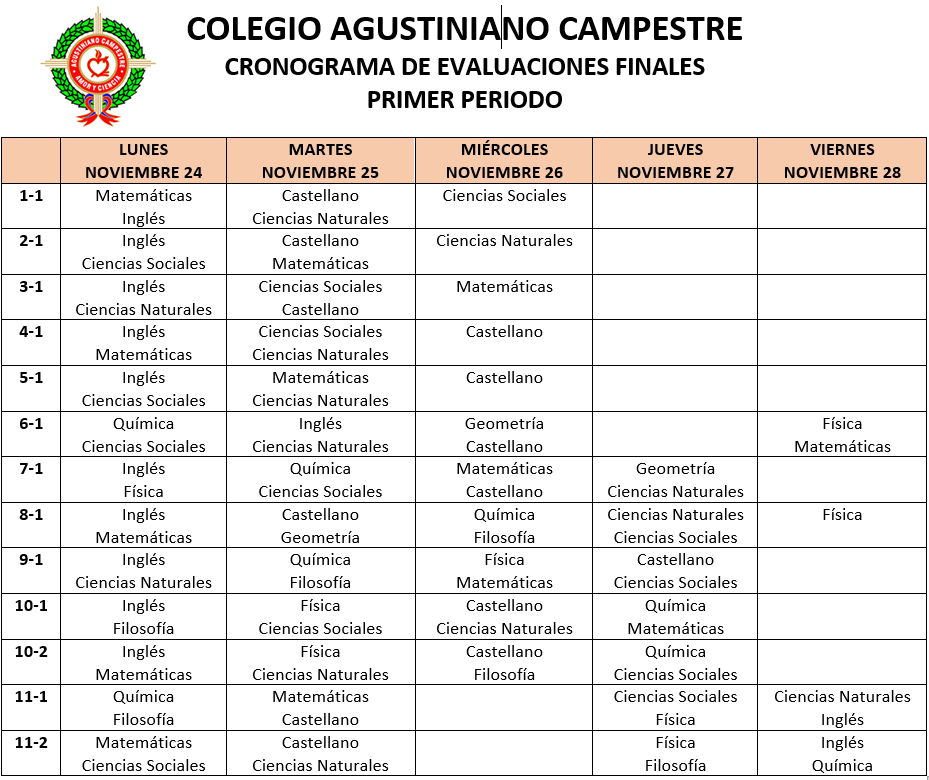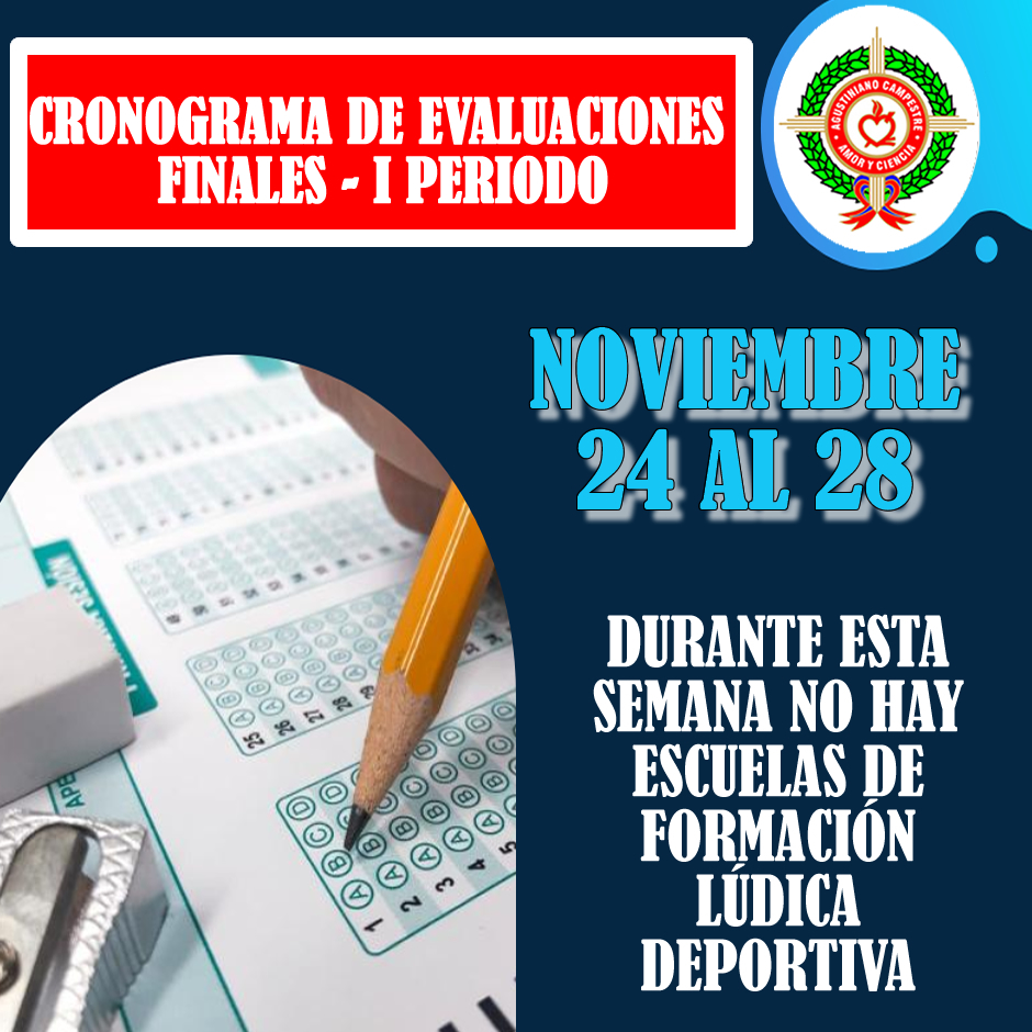 Socialización del cronograma de evaluaciones finales correspondientes al primer periodo que se llevarán a cabo en la semana del 24 al 28 de noviembre, así como el proceso de aplicación de las mismas. Le recordamos a padres, madres, acudientes y estudiantes, que durante esta jornada evaluativa no se desarrollarán las escuelas de formación lúdico deportivas.