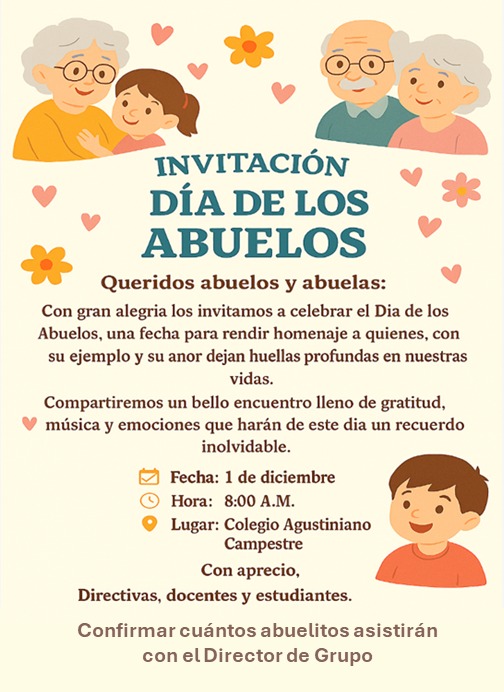 Queridas familias: Con mucho cariño les recordamos que el próximo 1 de diciembre celebraremos la apertura de la Navidad y el “Día del Abuelo”, una fecha especial para agradecer y honrar a esos seres que nos regalan ternura, historias y sabiduría.