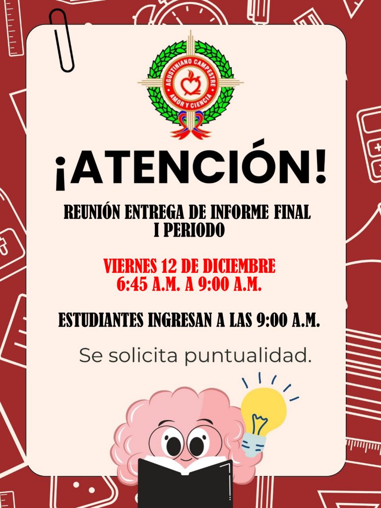Se informa a padres, madres y/o acudientes que este viernes 24 de octubre se realizará la reunión para la entrega del Informe Final. En esta reunión se informa los/las estudiantes que presentan bajo desempeño en una o más asignaturas.