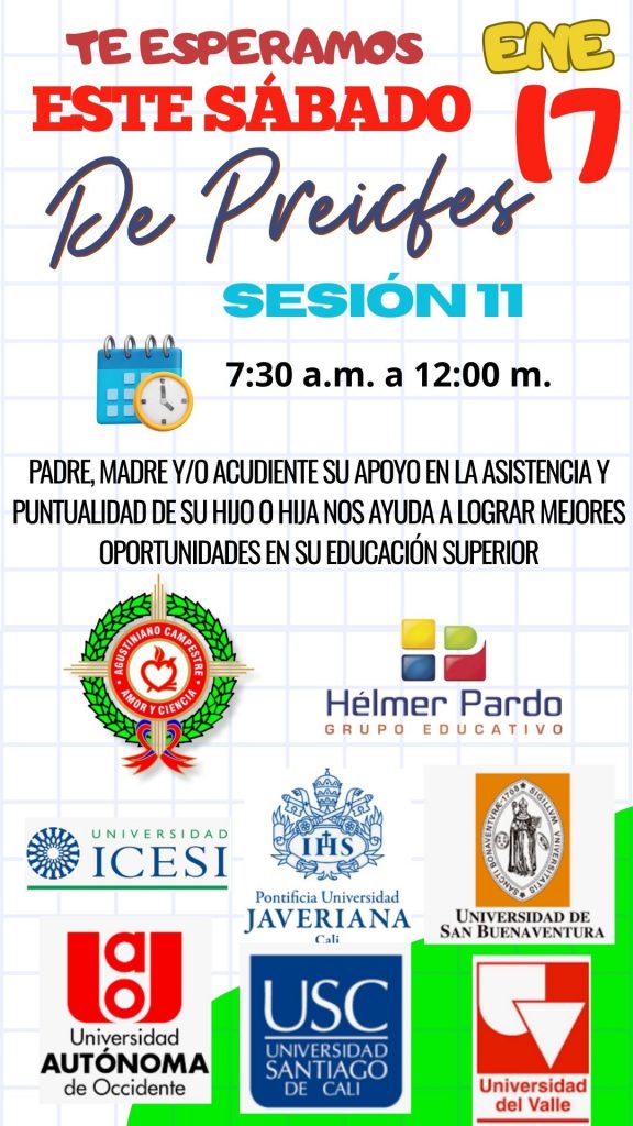 El próximo sábado 17 de enero tendremos clase del Preicfes para el grado décimo y undécimo, que se ha venido desarrollando en la institución. Estamos avanzando y nos encontramos en la sesión número 11. Reiteramos nuestro convencimiento de que este proceso les ayudará a nuestros jóvenes y señoritas afianzar sus competencias, habilidades y conocimientos para la presentación de la prueba Presaber Saber 11 el próximo 15 de marzo de 2026. Agradecemos el estar pendientes de la asistencia y puntualidad de su hijo o hija, teniendo en cuenta que cada sábado la sesión inicia a las 7:30 a.m. y termina a las 12:00 m.
