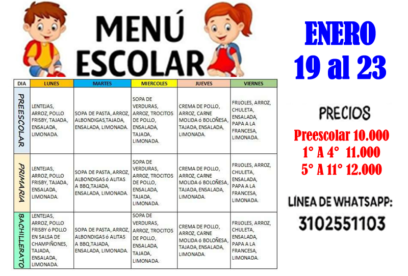 Un cordial saludo para toda nuestra comunidad educativa. Recordamos que la tienda escolar ofrece el servicio de restaurante y almuerzo para los estudiantes desde preescolar a undécimo. Compartimos con estudiantes, padres de familia y/o acudientes, las opciones de almuerzo que se tendrán a disposición del 19 al 23 de enero. Alguna inquietud, comunicarse directamente con la tienda escolar en el número que aparecen en la imagen
