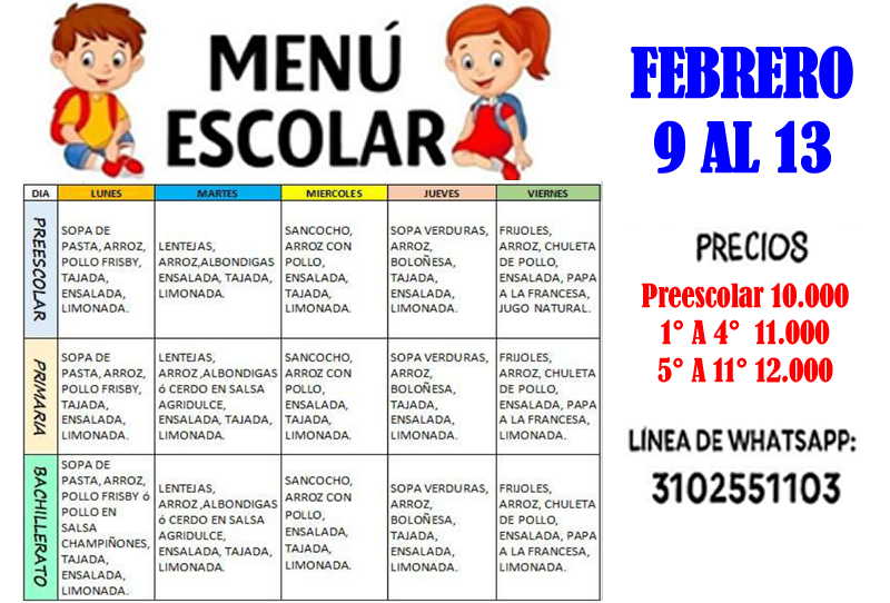 Un cordial saludo para toda nuestra comunidad educativa. Recordamos que la tienda escolar ofrece el servicio de restaurante y almuerzo para los estudiantes desde preescolar a undécimo. Compartimos con estudiantes, padres de familia y/o acudientes, las opciones de almuerzo que se tendrán a disposición del 9 al 13 de febrero. Alguna inquietud, comunicarse directamente con la tienda escolar en el número que aparecen en la imagen