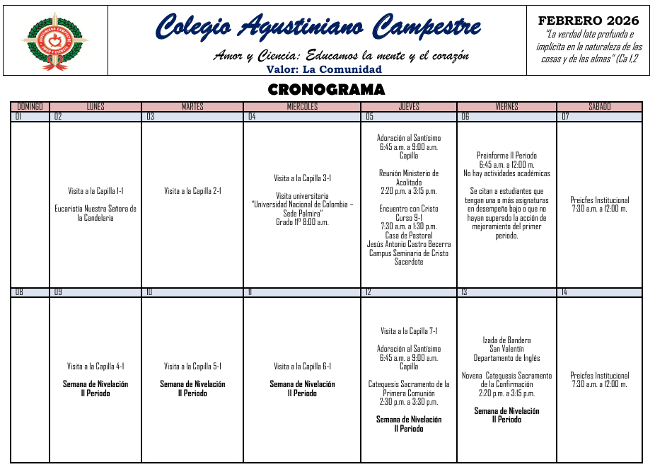 Un saludo de corazón agustiniano y un venturoso feliz año 2026 para estudiantes, padres, madres y/o acudientes. Compartimos con la comunidad educativa el cronograma de actividades correspondiente al mes de febrero de 2026. Sugerimos estar atentos a las fechas y eventos programados durante el mes.