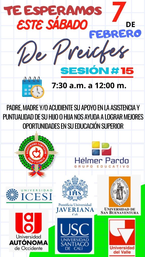 El próximo sábado 7 de febrero tendremos clase del Preicfes para el grado décimo y undécimo, que se ha venido desarrollando en la institución. Estamos avanzando y nos encontramos en la sesión número 15. Reiteramos nuestro convencimiento de que este proceso les ayudará a nuestros jóvenes y señoritas afianzar sus competencias, habilidades y conocimientos para la presentación de la prueba Presaber Saber 11 el próximo 15 de marzo de 2026. Agradecemos el estar pendientes de la asistencia y puntualidad de su hijo o hija, teniendo en cuenta que cada sábado la sesión inicia a las 7:30 a.m. y termina a las 12:00 m.