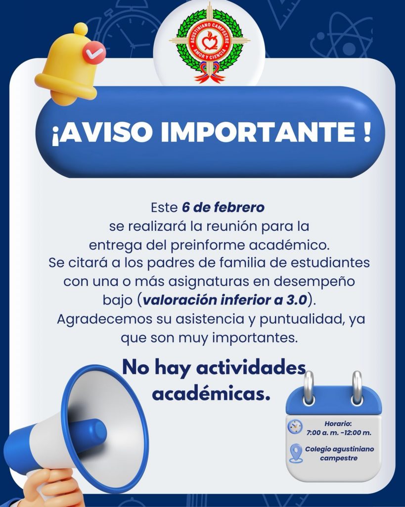 Se informa a la comunidad educativa que el día 6 de febrero se llevará a cabo la entrega del preinforme verbal del segundo período académico 2025 – 2026, para este informe se citarán a los padres de familia y/o acudientes de aquellos estudiantes que hayan sido reportados en una o más asignaturas con bajo desempeño.