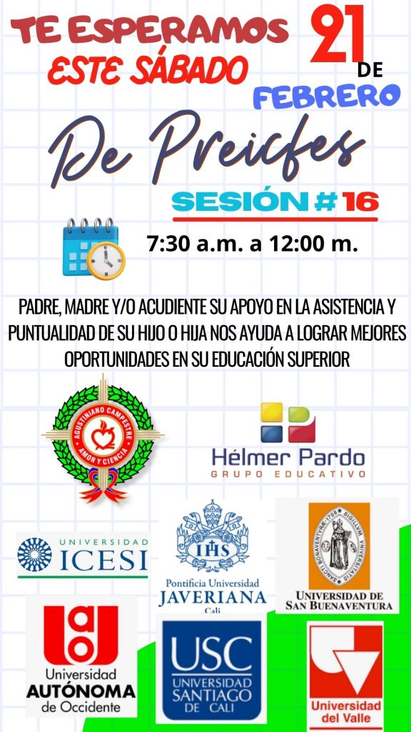 El próximo sábado 21 de febrero tendremos clase del Preicfes para el grado décimo y undécimo. Estamos avanzando y nos encontramos en la sesión número 17, faltando 1 sesión más para terminarlo.