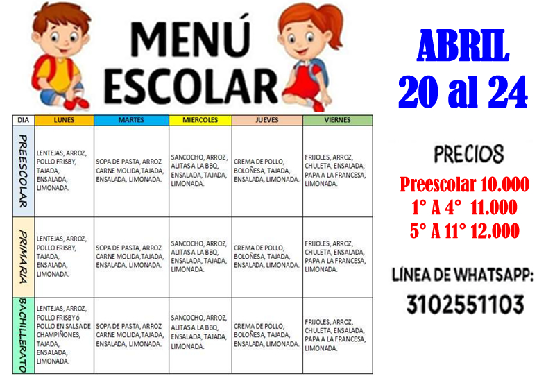 Un cordial saludo para toda nuestra comunidad educativa. Recordamos que la tienda escolar ofrece el servicio de restaurante y almuerzo para los estudiantes desde preescolar a undécimo. Compartimos con estudiantes, padres de familia y/o acudientes, las opciones de almuerzo que se tendrán a disposición del 20 al 24 de abril. Alguna inquietud, comunicarse directamente con la tienda escolar en el número que aparecen en la imagen