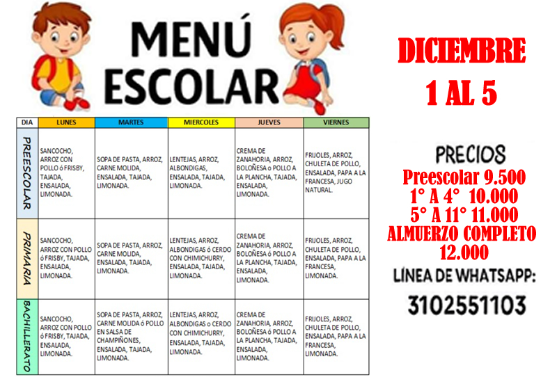 Recordamos a nuestra comunidad educativa que la tienda escolar ofrece el servicio de restaurante y almuerzo para los estudiantes desde preescolar a undécimo. Compartimos con estudiantes, padres de familia y/o acudientes, las opciones de almuerzo que se tendrán a disposición entre 1 y el 5 de diciembre. Alguna inquietud, con gusto será atendido directamente con la tienda escolar en los datos que aparecen en la imagen.